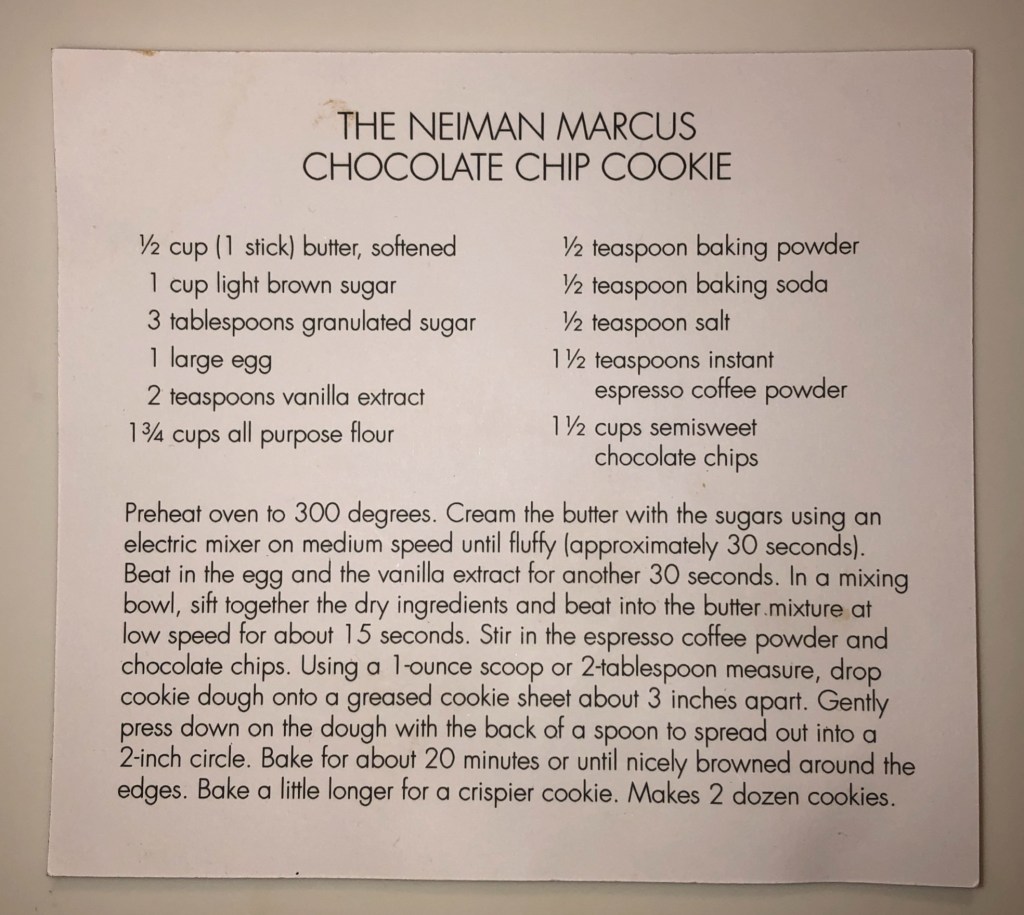 My favorite good old fashioned chocolate chip cookie recipe is from Neiman Marcus. It’s basically Nestle Toll House Cookie recipe but add espresso powder!