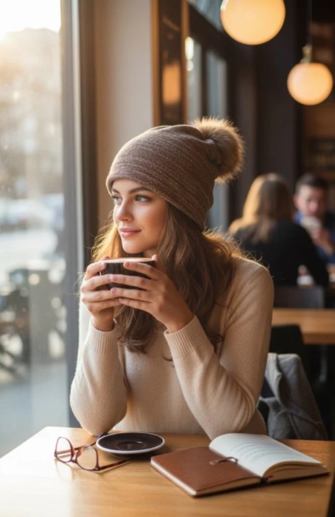 There’s something timeless about a cozy café look—simple knits, warm neutrals, and an effortlessly relaxed feel. A soft sweater paired with a knit beanie creates an easy winter uniform that feels casual but still intentional. The beanie, initially donned for warmth, immediately becomes part of “the look.”